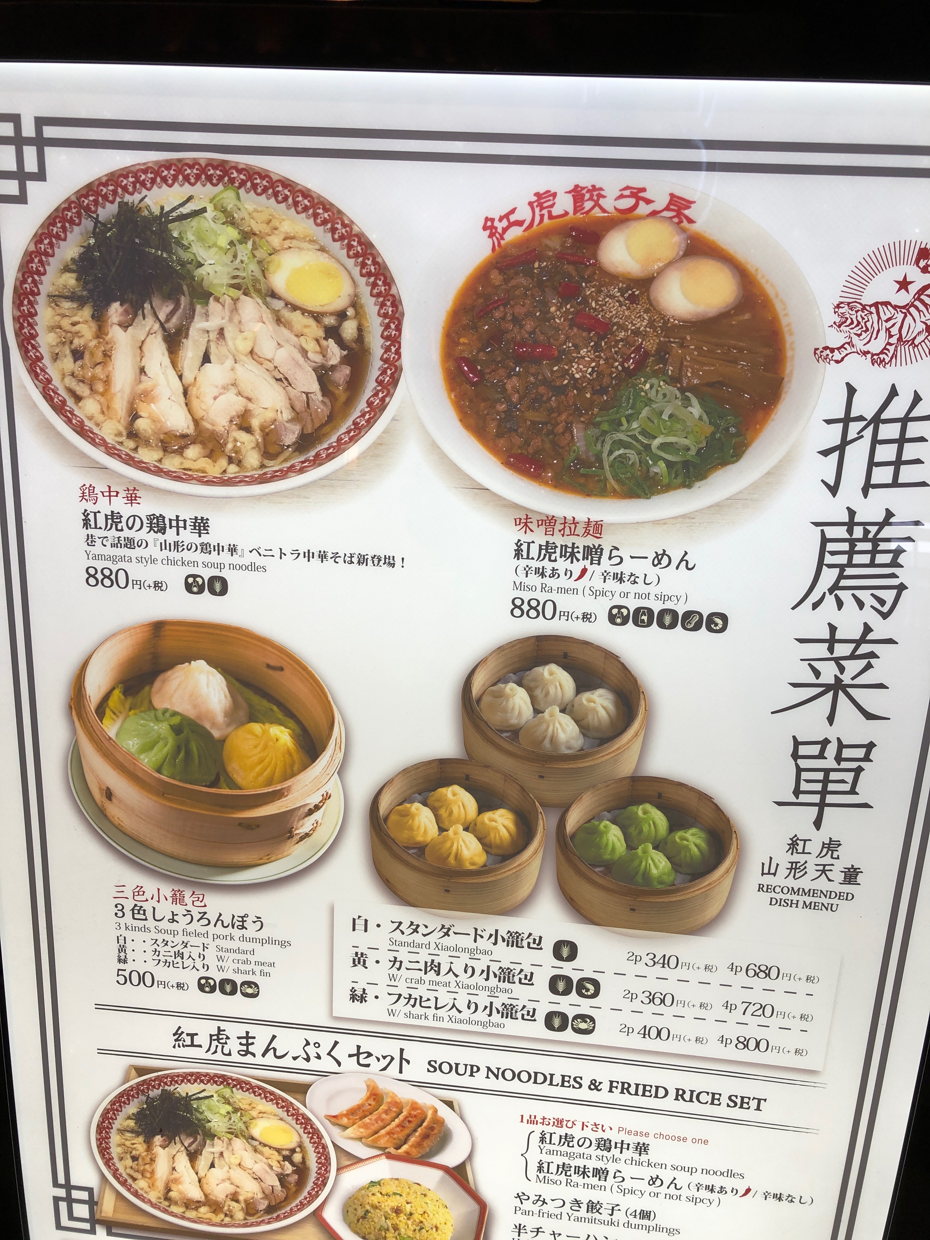 帰りがけに立ち寄ったイオン天童の中で発見した。鶏中華が、定番を押しのけている。本格中華のはずの紅虎でも、ローカルメニュー「鶏中華」がトップ推し。