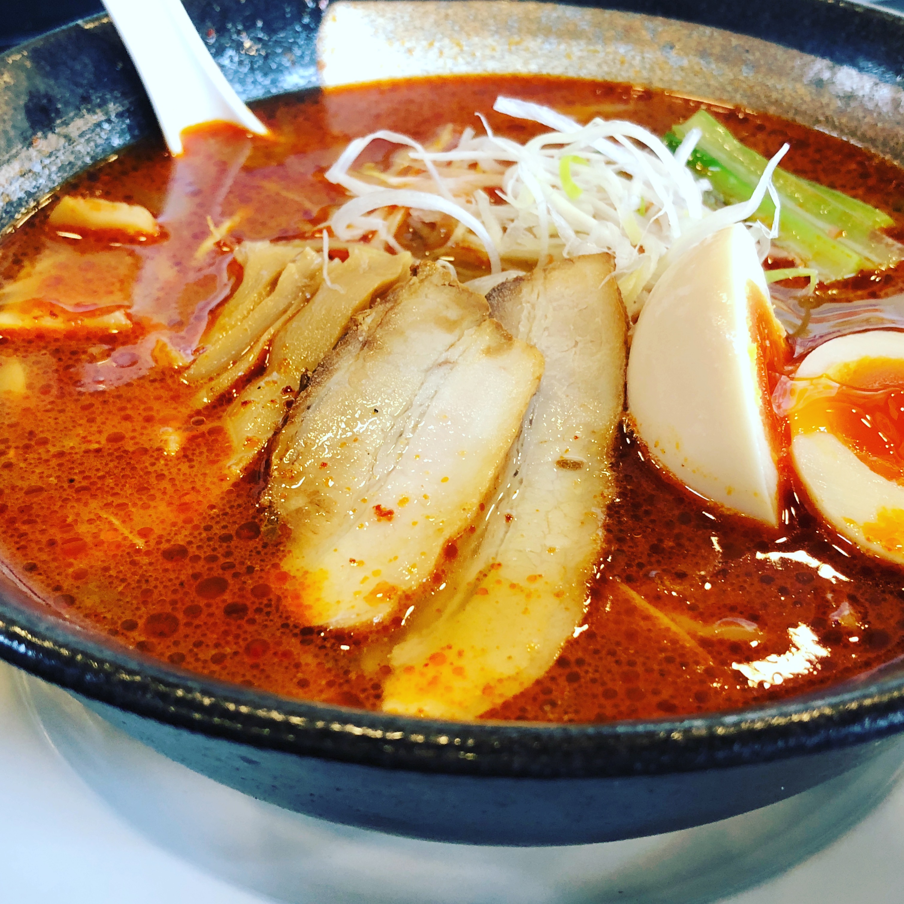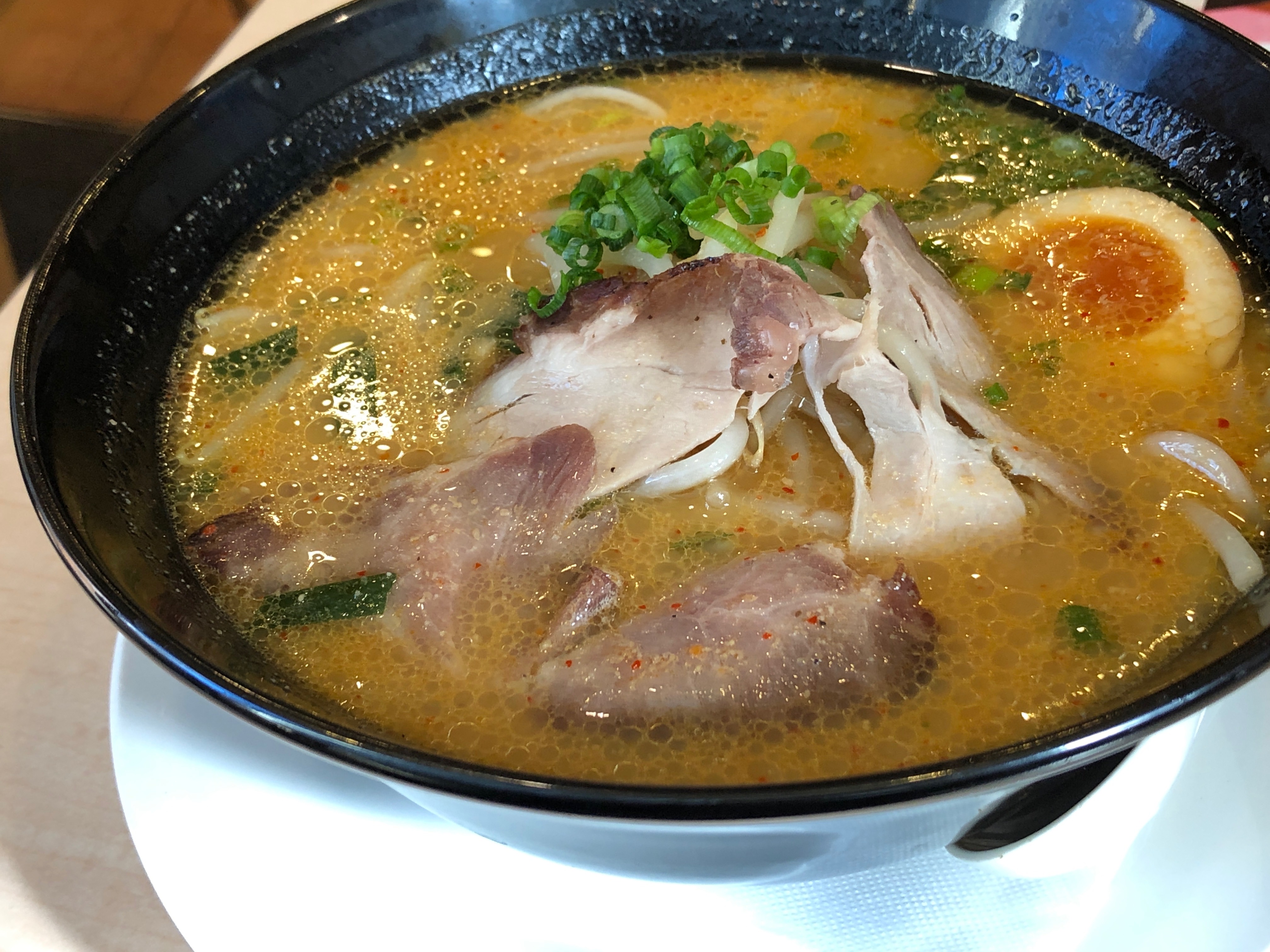 麺が固まっている。冷凍麺を使っているので、麺の腰はある。ただし、茹で上がった後に丼に入れてしばし放置、そのままスープを放り込んだので麺がすっかり固まっている。