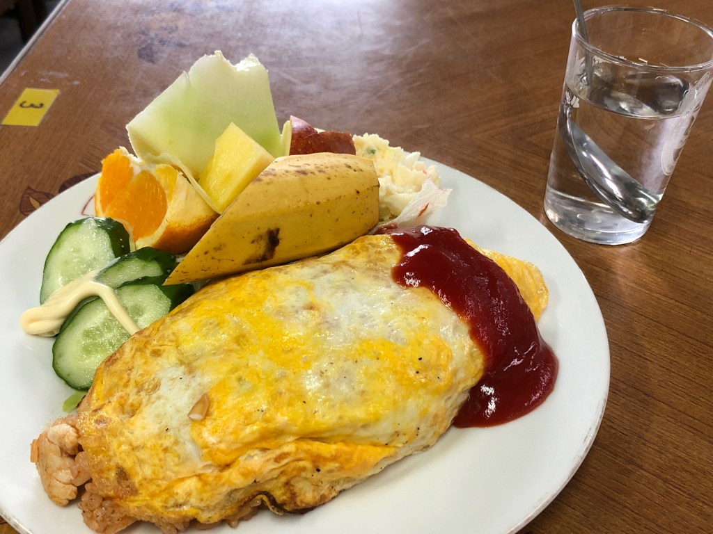 壁に貼ってあるメニューより、志木市の方が多い。ということは、名店なのだろうと、期待を込めて、何は無くともオムライスを注文した。薄い卵焼きに包まれたケチャップ味のチキンライス。ケチャップがたっぷりとかかっていて、あー、これこれ、これが食べたかったのだよ。予想外だったのは、添え物のサラダとフルーツ。なんとバナナとメロンだ。50年前にこれを食べていたら、一生この店のファンになりますと誓っていただろう。なんとも親父殺しのメニューだと納得しながらめずらしく完食した。もう一つ付け加えると、昔はこのように水を入れたコップにスプーンが入って出てきたものだ。ナプキンなどという小洒落たものが出てきたのは、昭和も半分を過ぎた50年ころになってからだったような記憶がある。デパートの大食堂もこんな感じだった。ファミレスなんてまだ存在すらなかった時代からの遺物。感謝しなければ。