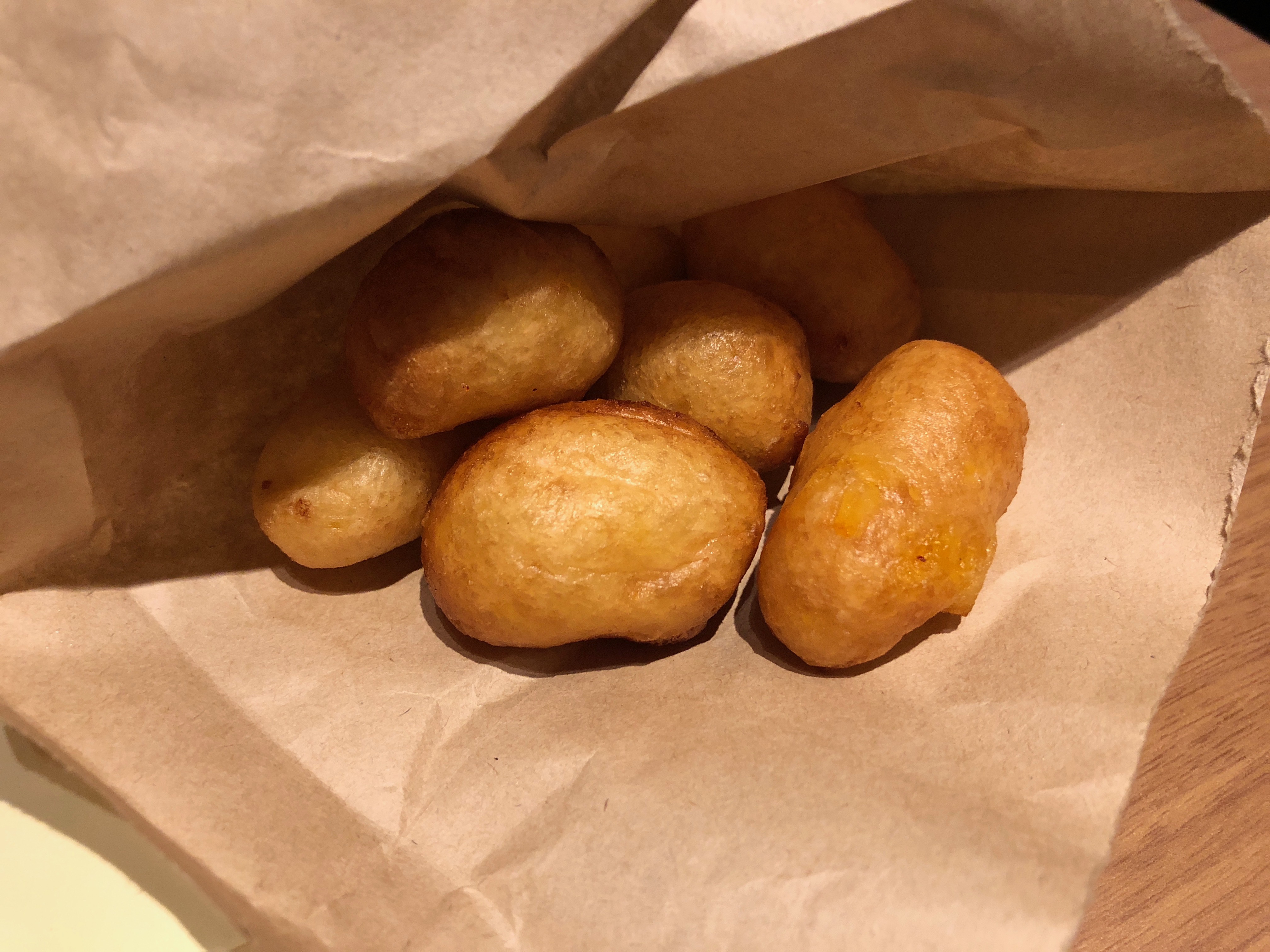 ピザ生地を丸めて揚げただけという、なんだかビジュアル的に如何なものかと言いたい代物だが、食べるとなかなか美味い。位置付けとしてはフライドポテトだろうけど、コレも揚げ物というより軽めのショッかkんだし、付け合わせとしては良いかもしれない。フレーバーのついた砂糖をまぶすとか、オリーブオイルとハーブのソースをつけるとか。軽めにサクッと揚げるというのはなかなか難しいだけに。サイドアイテムとしては面白いなあ。