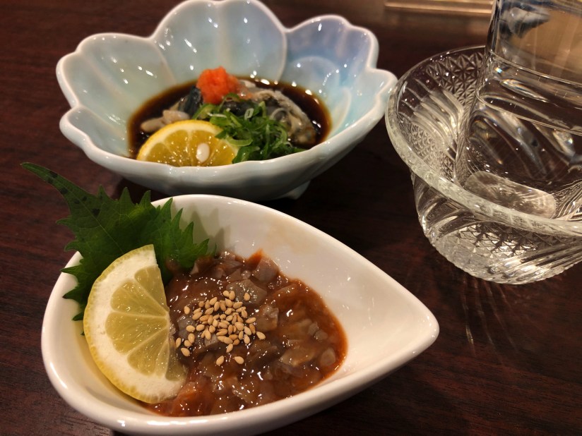 そうだった、むろとはマグロの遠洋漁業の一大基地であった。マグロ船のコックさんの話も読んだことがある。ということで注文したのは、珍しいマグロの酒盗、土佐の地ガキ(だいぶ小粒)のポン酢あえ、そして地元の名酒。うむ、満足度高いなあ。