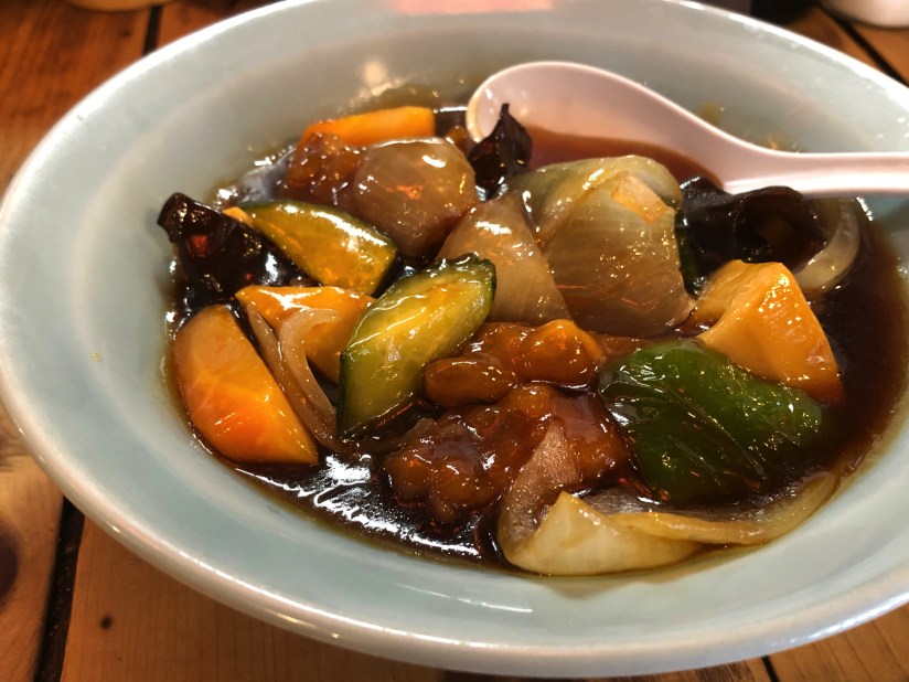 さて、この店は居酒屋なので「高知の食べ物」として鰹のタタキとか、ウツボの唐揚げとか、いかにも高知的なものが揃っている。しかし、それは横に置いておき、街の中華屋的メニューを頼むのが良いのだ。ということで、酢豚、それもきゅうりが入った西日本系酢豚が登場。これはすばちょっときつめなので、ビールによく合う。好みだ。きゅうりがなんとも言えないアクセント。東日本系では、これがパイナップルになる。これもまた甘酸っぱくて良いが。自分勝手に東日本は横浜中華街の広州系チャイニーズが源流で、西日本は神戸南京町発の上海系チャイニーズではないかとにらんでいるのだが・・・。とにかく、高知で酢豚と言えばこの店だ。(断定してしまう)
