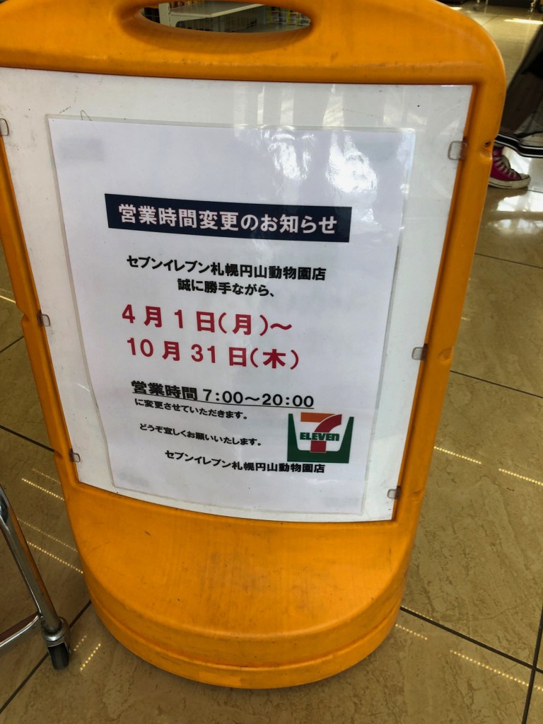 24時間営業の是非について、いまだにもめているセブンイレブンだが、ついに営業時間の変更を認める旨のコメントが出た。でも、そのずっと前にセブンイレブン 朝7時から夜11時までよりもっと短いセブン・エイト 7ー8の営業時間宣言をしていたので、記念に撮っておいた。確かに動物園の入口脇のお店だから、夜は人ではなくキタキツネかヒグマくらいしか通らないよね。