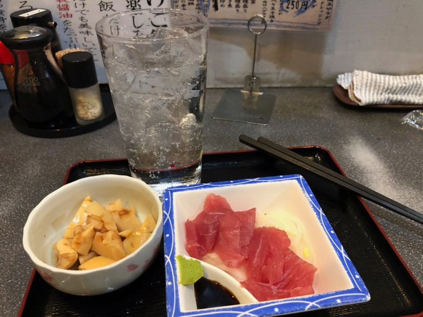 飲み物もサワーを中心に豊富なメニュで、コップで日本酒飲んでクダを巻く的なイメージはない。つまみも100円から500円くらいまで、自ブウの好みと懐に合わせて頼めば良い。マグロブツは高い方、メンマは安い方の代表か。ともかく、自分の好きなものを好きなように食べるというのが一人飲みの醍醐味で、誰にも遠慮せず独り占め。これが嬉しい。珍しく酎ハイを頼んだら、お店の人に何も入れなくていいのと聞かれた。しかし、これが正統安い焼酎の飲み方なのだ。