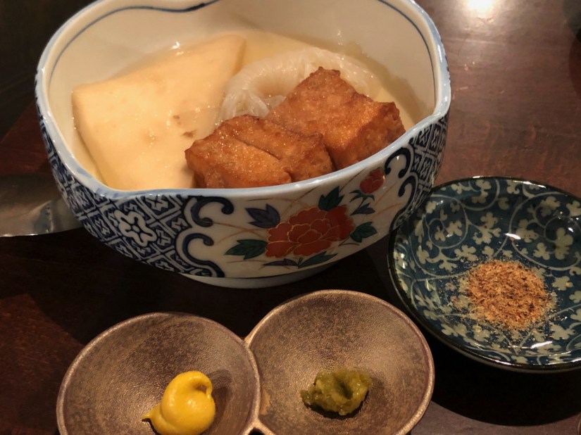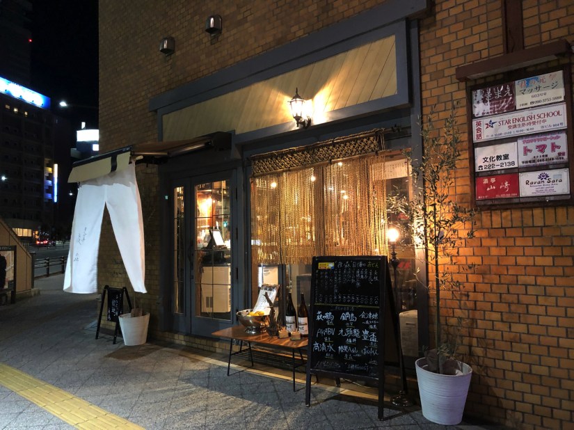 この店の表はこんな感じ。縄のれんだからさっくりと飲んでさっくりと帰ろうと思ったら、隣の席に来たのはチャイニーズの女性二人組。メニューが日本語(それも毛筆書き)だけに苦労していたが、それも旅の楽しみだよねと、横で見ているだけにした。お店の人は一生懸命英語で会話を試みるのだが、女性陣は英語も苦手らしい。写真入りのメニュー大事だなと思いながら、日本酒はラベルみてもわかんないだろうし・・・。