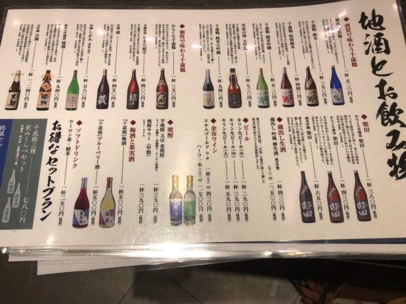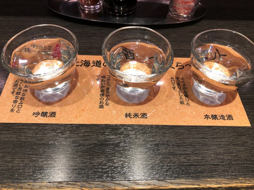 日本酒は当たり前ながら千歳鶴ブランドのものが、各種取り揃えられている。おすすめはこの三種の味比べセットらしい。ちなみに吟醸酒とは米の精米歩合が高いものをいう。アルコール発酵の調整をするため、醸造の途中でアルコールを添加する。したがって純米酒ではない。
