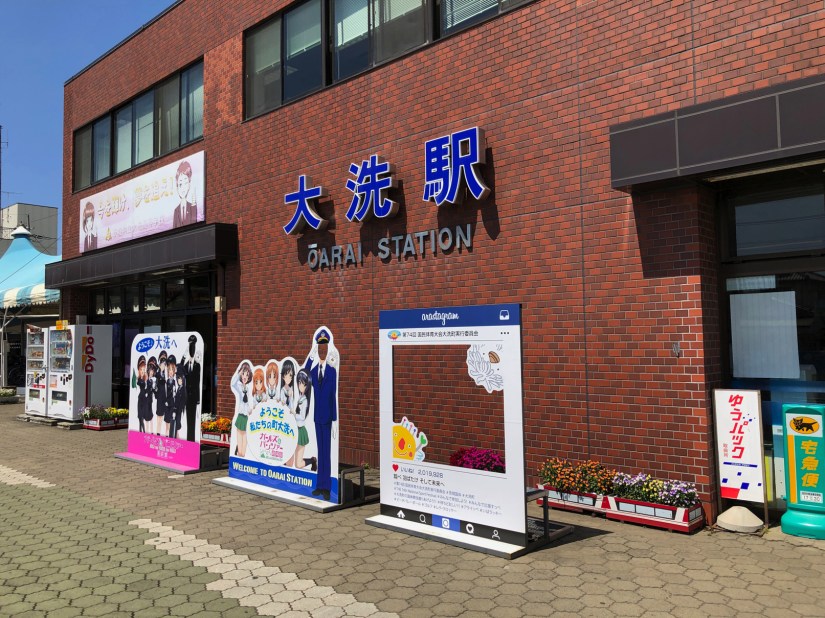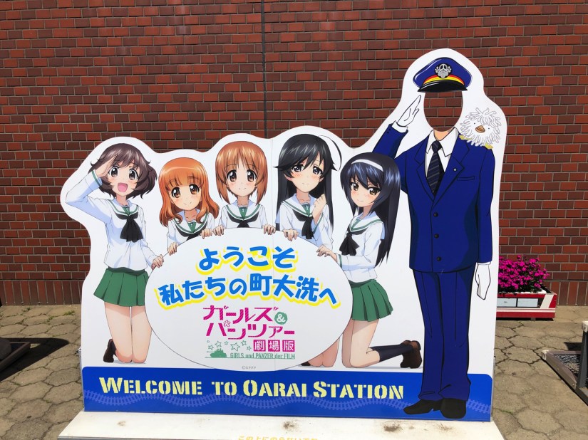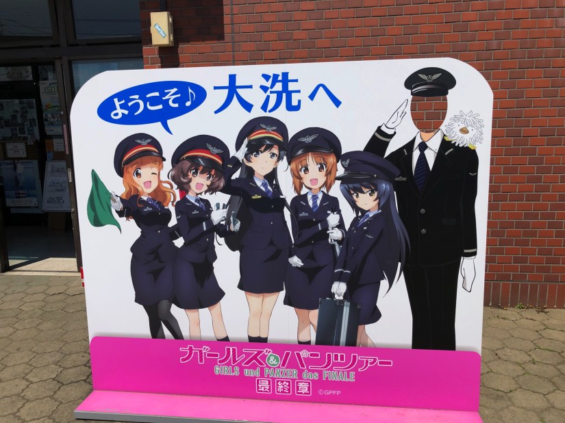 というわけで大洗駅まで駅弁を買いに来たら、駅の前が何やら賑やかになっている。撮影スポットらしいい。これにいた光景は石巻駅でもあった。アニメキャラのお出迎え。というやつだ。