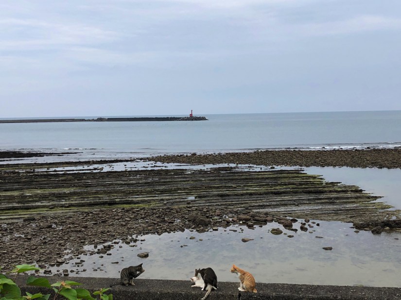 鹿児島から志布志湾を抜けて宮崎に入ると、その途中にあるのが、この洗濯板(そもそも洗濯板の現物を見たことがある者はそろそろ消滅しつつある)のような海岸で、なぜかのんびりしている猫を発見した。海沿いでは猫が多いのだろうか。自分で魚を取るとは思えないが。