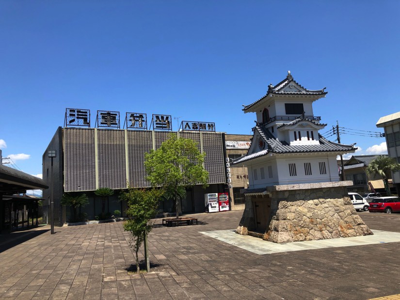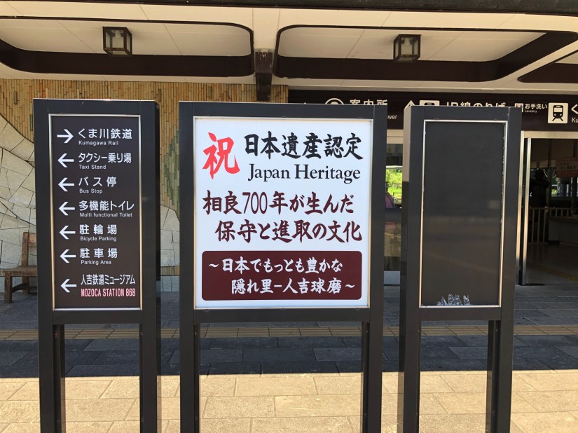 熊本県人吉市に足を入れたのは初めてだ。人吉の名前で何を思い出すかといえば、「巨人の星」に登場する左門の出身地で、球磨焼酎の本場ということぐらい。あとはJRの路線で有名なスイッチバックがあることも記憶にある。ということで駅前に行ってみたら、こんな看板が。