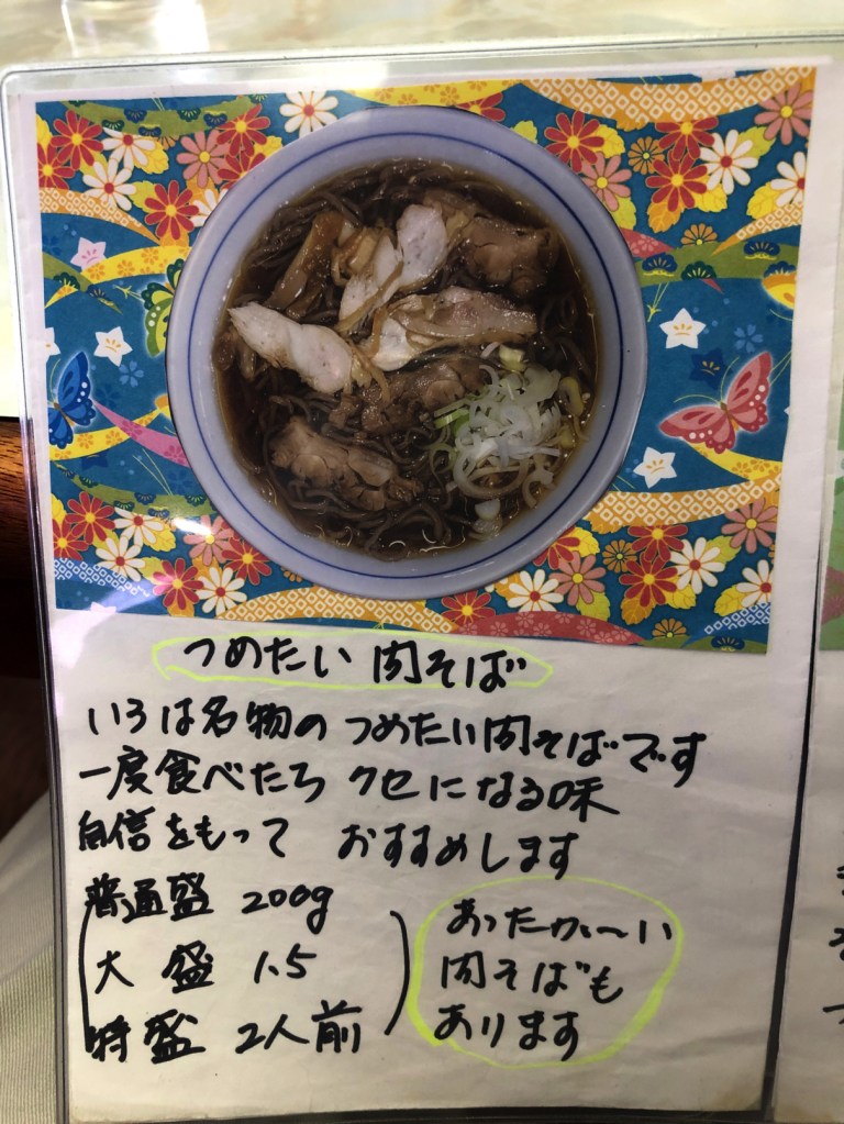 蕎麦屋なので、当然普通の日本蕎麦メニューもある。ザルやかけそばがあるし、山形名物板そばもしっかりありだ。すごいのが、ラーメン類というメニューで、ラーメンと冷たいラーメンは、肉そばの麺が中華麺になり、スープが多少強くなっているものらしく、これはうまそうだ。