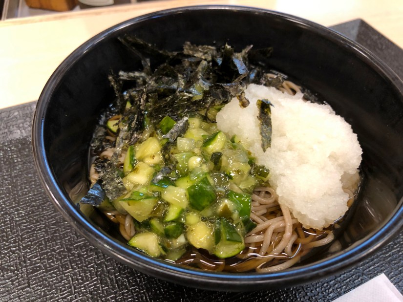 松乃家は、日本中あちこちにある牛めし松屋のとんかつバージョンの店だが、なぜか蕎麦も注文できる。松屋は夏になると、山形のだし、野菜をみじん切りにして出汁で和えたものを、牛丼に乗せたメニューを売っている。ダシ牛丼は、トッピング牛丼の走りみたいなものだ。その山形のだしを冷たいそばの上にかけて、山菜そば風に仕立てたものがこいつ。意外とあっさり系でシャキシャキとした歯ざわりがそばに合う。これはジャンクフード屋としては珍しい「上手いもの」に仕上がっている。夏の蒸し暑い朝に食べるには最適、宮崎の冷や汁に通じるものがある。