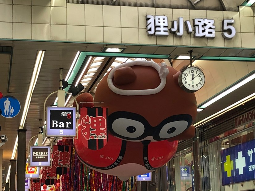 流石に12時は、まだ飲んだくれもいない。今年初登場と思われる巨大なたぬき様は、天井からフライングボディーアタックの体制で通行人を睨んでいる。ちなみに狸小路は1丁目から10丁目まで続く1lm余りの商店街だが、今は8丁目を過ぎるとお店もまばら、屋根も無くなるので、実質的には7丁目までということか。昔、この辺りはさおっぽろ一の歓楽街すすきのの横で商売していたので、映画館や食堂などが大変たくさんあった。そして、寂れてしまった8丁目、9丁目には昔のラブホ「連れ込み宿」が何軒もあった。そちら方向に向かうと、まるで狸に化かされるような目にあうことから狸小路と呼ばれるようになった、という俗説を聞いたことがある。札幌も開拓時代は昔のお江戸と同じで、男女の人口比が極端に男寄りだったから、歓楽地、そして男女友好の地では、狸に化かされたような思いをしても仕方がないと諦めるくらい必死だったと思われる。そう思えば、悲しいなあ、狸小路という名前は。