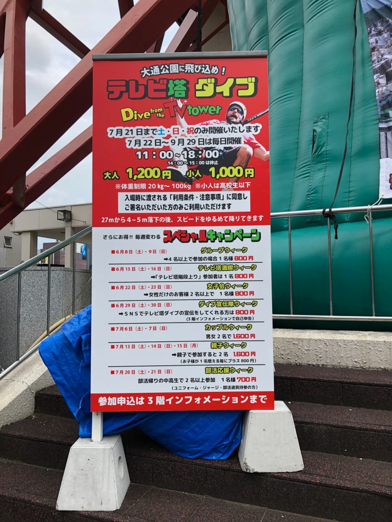 この案内板の通り、季節限定イベントなので、札幌観光のついでにはよろしいかと。冬になったら、雪でダイブスポットでも作れば、外国人観光客、特に雪のない南の国の人には受けるかもしれないと思う。