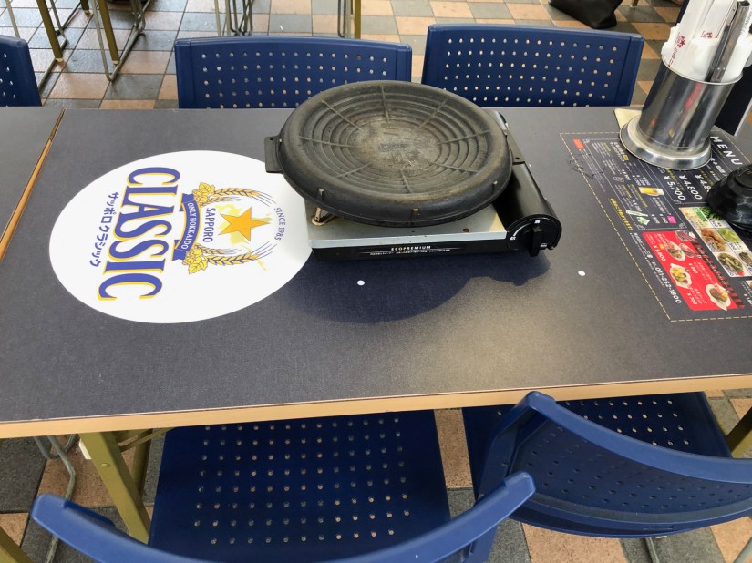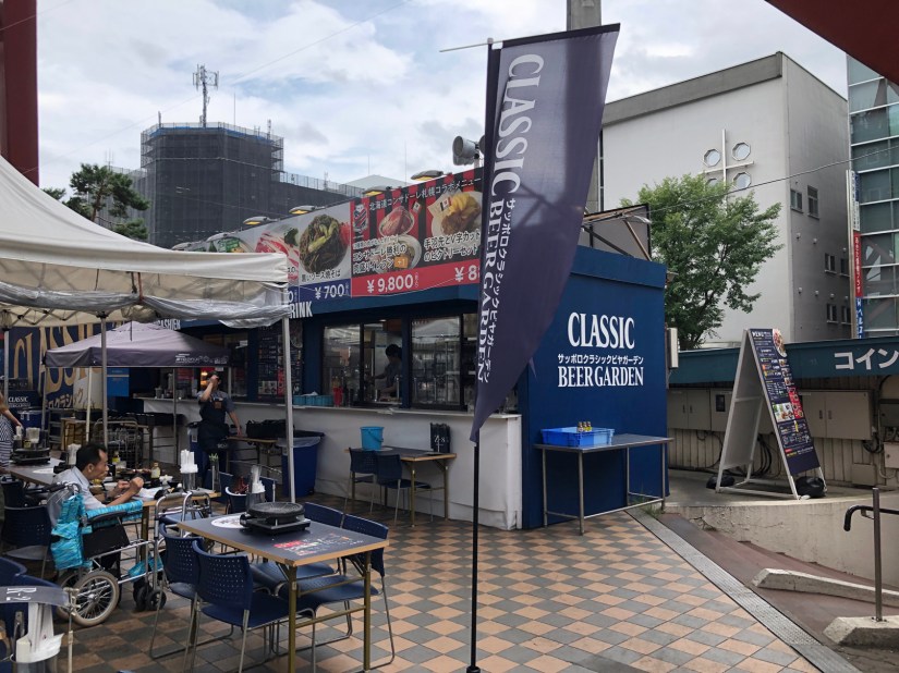 (この鍋は裏返っていますが、)カウンターで注文したら簡単にジンギスカンが食べられる、トイレはすぐ近くにある、ビール飲み放題、飲み疲れたら歩いて50mでタクシーに乗れる。実は、テレビ塔下は札幌で有数の屋外ビヤガーデンなのですよ。ここは絶対の隠れスポットだと思う。ただし、季節限定で夏だけ。と思うと、それは間違い。なんと、クソ寒い11−12月に開かれる冬まつりでは、この辺りがビニールハウスで囲われた飲み屋に変身する。夏でも冬でもサッポロクラシックを飲みまくる、すごいぞ札幌の人たち。
