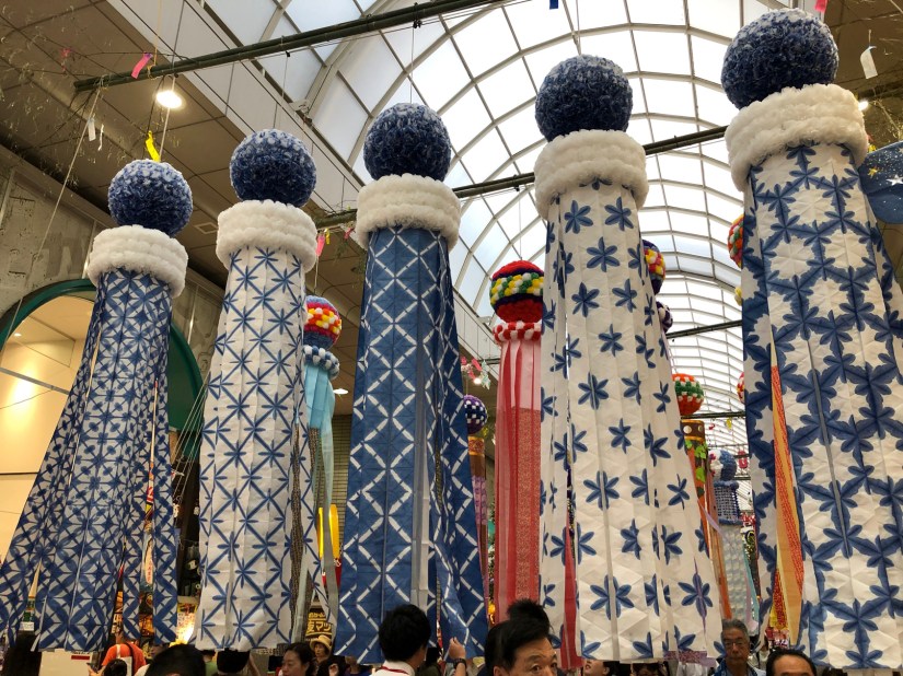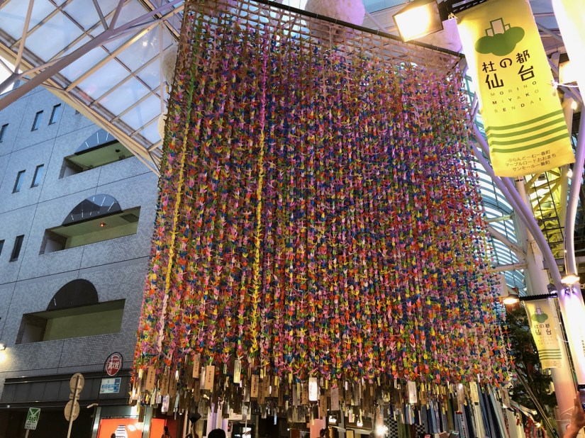 仙台の七夕は商店街の威信をかけたイベントなのだろう。それぞれの屋号をつけた七夕飾りがこれでもかと並んでいるのだが、やはり圧巻は仙台を代表する百貨店「藤崎」前のツルの飾り。当然ライトアップもされているので絢爛豪華で、きらびやかだ。ちょっとイラけた場所にもなっているため、インスタ向けスポットとなっている。周り中がアングル求めて右往左往しながら写真を撮っている。外国人観光客も混ざっているが、七夕自体があまり宗教色が強いイベントでもないので、綺麗な飾り付けのフェスティバルとして楽しんでいるようで、それは良いことだな。