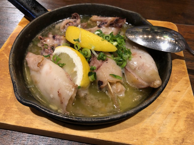 仙台の梵天グループは、実に魅力的な一杯向けメニューを開発してくれる。このイカのアヒージョは、季節メニューだと思うのだが、メニューに載っていればいつでも頼んでしまう。レモンの酸味とにんにくがよく合う。冷たい赤ワイン(ロックでがぶ飲み)と、熱々のイカで、夏の夜は幸せになる。イカを食べきったらバゲットを頼んで、ソースと絡めて食べる。幸福が二倍になる。