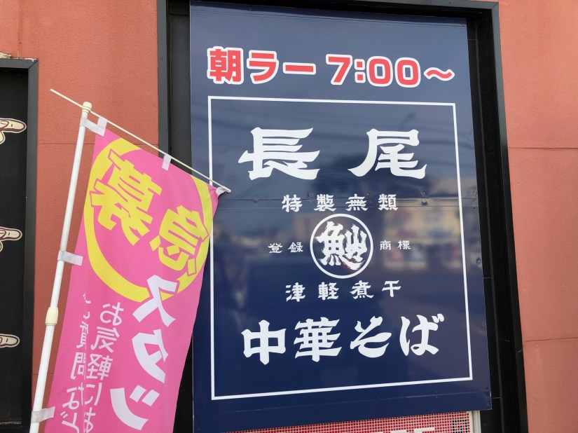 改めて駐車場に車を止めて看板を見ると、朝7時開店の中華そば屋だった。青森で主流と言われる「煮干しスープ」の店だ。同じ長尾中華そばでは、駅前店で食べた煮干しそばが衝撃的なうまさだった記憶がある。しかし、これが同じ店なのか?という疑問が朝の脳細胞を満たしていく。