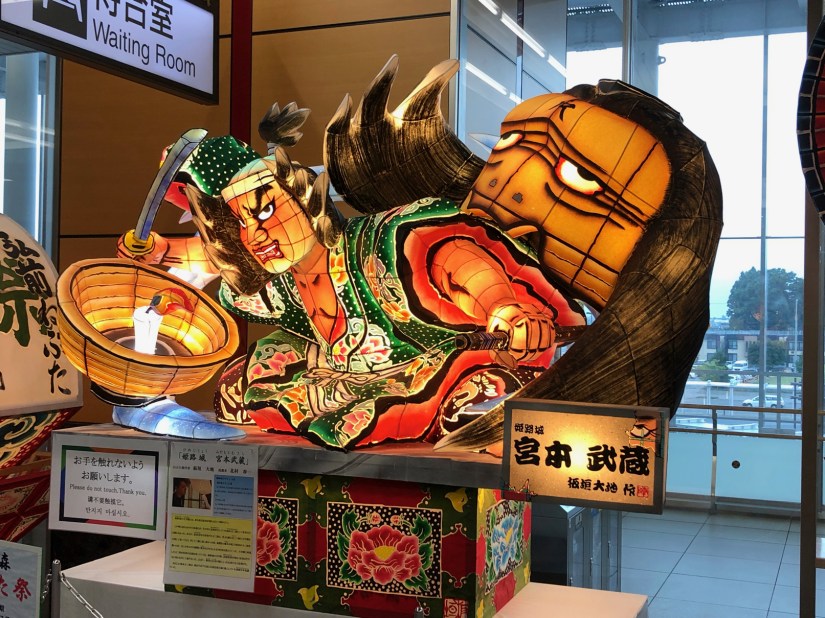 夏のねぶた祭りが終わったばかりのせいか、駅構内にねぶたのミニサイズが展示されていた。新幹線乗り継ぎ客は足を止めることなく通り過ぎているのが残念だ。個人的にねぶたは好きなので、しばらく眺めていた。乗り換え時間に余裕があってよかった。