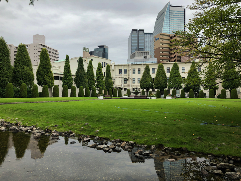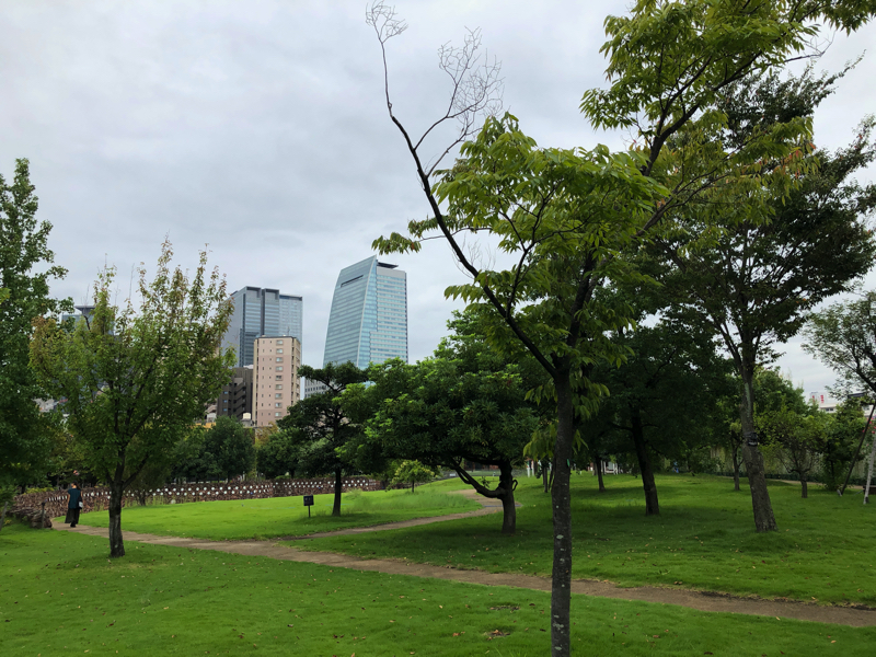 このノリタケスクエアといわれる工場跡地は、きれいな都市型公園として造成されている。芝生の向こうに見える名古屋駅そばの高層ビルが、これもまた奇妙なアンバランス美に見える。