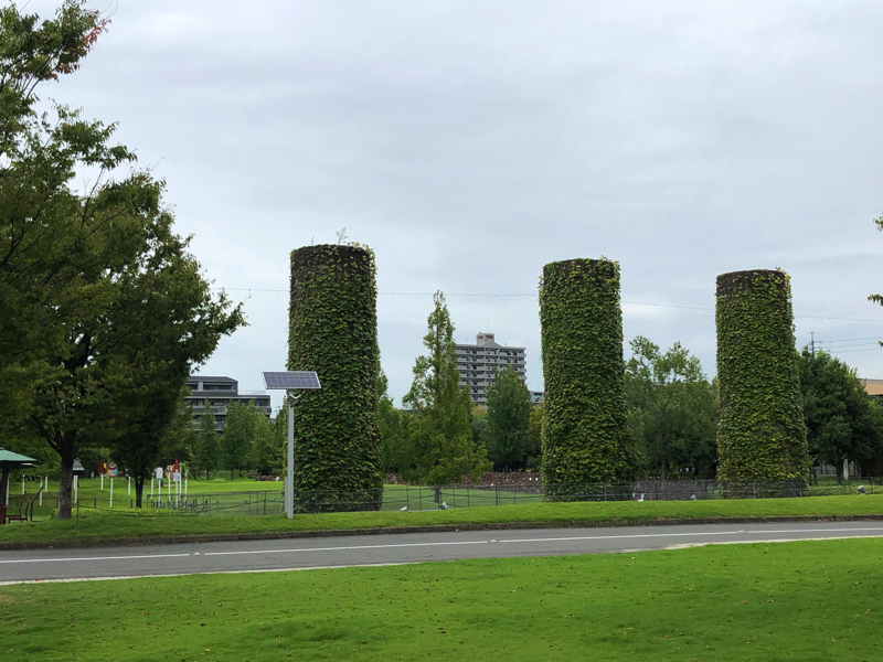 その左右にある緑の円筒が立っている場所こそが、旧ノリタケ工場であったらしい。緑の円筒は焼き物窯の煙突のあととのこと。