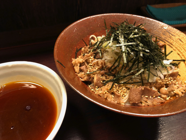 また、ここの名物の一つが「肉そば」。いわゆるラー油蕎麦で、つけつゆは甘辛、ラー油が入って辛い。丼に盛られた冷たい蕎麦に牛肉の茹でたもの、胡麻と海苔がたっぷりかかっていて、長ネギも大量投下。いわゆる「みなとや」インスパイア系という奴だ。だが、これはいただけない。そばが「普通の蕎麦」を使っている。ラー油そばは基本的に、山形の板そば、冷たい鳥蕎麦などで使われる太めで歯応えがあるもの、もちっとした食感があるものが定番だ。普通の蕎麦のように細くて歯切れが良いのは、やはりラー油入りのつゆには合わないのだ。それでも何度か試してみたのだが、やはりこれは好きになれない。普通の蕎麦とラー油蕎麦用の太い蕎麦と、2種類持って欲しいと思うのは、自分だけではないと思うのだが。