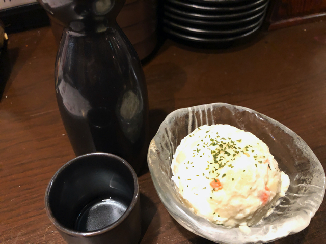 まずは熱燗とポテトサラダを注文。これは居酒屋に行って、真っ先に行うオペレーションチェックなのだ。最近、熱燗は電子レンジでという店が増えてきた。レンジアップすると徳利の上のほうが熱くて持てなくなる。燗付け機だと徳利の下の方が熱めになる。個人的には燗付け機の熱燗が好みだ。ポテトサラダは工場製造のものがほとんどで、どうしてもマッシュポテトっぽくなる。工場製造でもポテトのゴロリ感を再現しているものもあって、なかなか油断がならない。マッシュポテト的なポテサラは好みではない。
