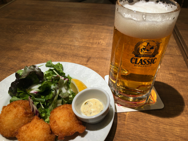 その後、別の日に、札幌駅地下にある銀座ライオンに行った。つまりここは、ニュー三幸の兄貴分みたいな店ということだ。実は銀座ライオン札幌駅地下店?は昼のみの穴場で、特に旅行者が列車待ち空いた時間の空にビールを飲んでいるという感がアリアリで、良い顔して飲んでいる人が多い。昼間のビールはうまそうだなと、羨ましがっていたものだが。ようやくそういううらやましいことができるようになったので、ホタテフライとサッポロクラシックを注文する。この帆立フライが、北海道ではほとんどお目にかからないメニューになってしまった。逆に北海道で獲れないはずのアジフライが、ミックスフライ定食とかいって出てくるご時世、なんとも腹立たしいが。とりあえずライオンでは帆立フライが食べられる。欲を言えば、もう少しタルタルソースを多めにして欲しい。ビールには揚げたてのフライがよく合う。