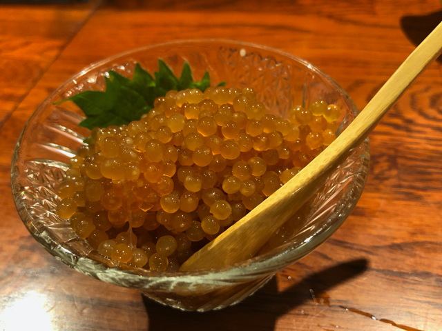 魚卵料理は数々あるが、このカジカのコッコは新鮮なカジカが手に入る時期にしか食べられない。粒は大きめだが、いくらより二回りくらい小さいイメージ。皮が硬く、食感はキャビアに似ている。味は薄味のイクラという感じがする。あまりしょっぱくないので、そのままスプーンですくってぽりぽりと噛み締める。プチっと弾ける。濃厚な卵液が口の中に広がり、そこに冷酒を流し込む。絶妙だ。