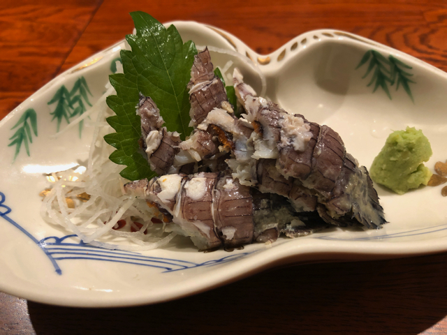 二品目はシャコ。小樽あたりで取れるシャコは大振りで、自分で買ってきて茹で上げて食べることもあるが、相当でかいシャコを買ってきても殻を外すと驚くほど小さくなってしまうのがいつも残念。おそらく体長20cm以上のシャコを捌いても、この写真のサイズには届かないのではないか。シャコは子持ちのメス(こっこ入りね)がうまいと思うが、肉自体を味わいたいならオスがよろしい。お財布に余裕があればオスメス一尾ずつ頼むのがおすすめ。北海道は春と秋にシャコの旬があるので、5月初旬と10月下旬くらいに行くと食べられるはず。最近は漁期にブレがあるらしく運任せになりがちだが。お江戸のシャコとは一味違う、これも北海道的珍味だ。