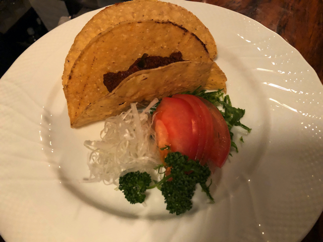 もう一品がタコス。これもメキシカンレストランで食事として食べるタコスとは相当違う。酒の肴としてのタコスで、チーズも少なめだし。本格的なタコスはタコビーンの油との戦いになるが、このタコスにはそんなめんどおう臭いことは起きない。サク、サラッと食べられる。タコミートの辛味がそもそも適量というか、マイルドだからだろう。