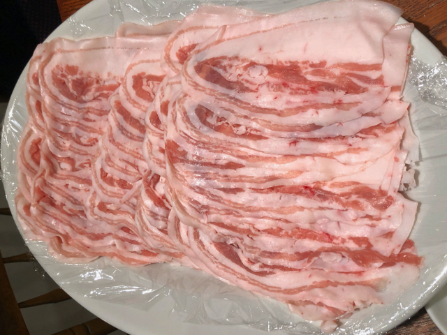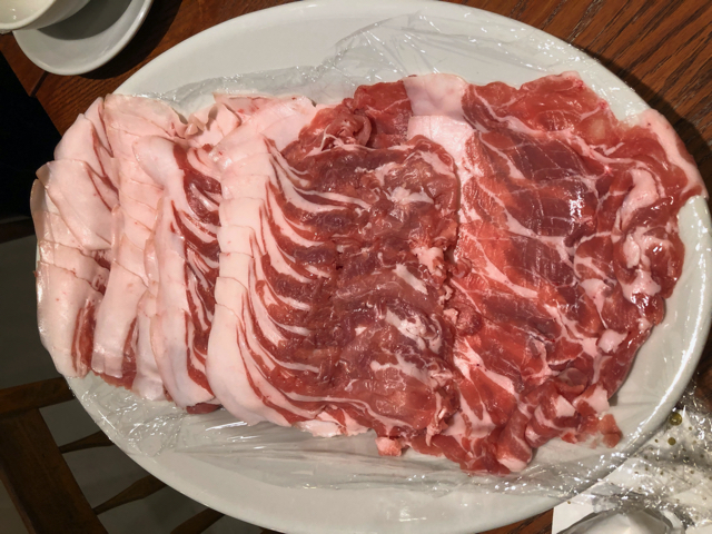 続いてバラ肉。これも脂身の甘味が際立つが、薄く切った長ネギをしゃぶしゃぶしてバラ肉で巻いて食べると、うまさが倍増する。見た目は脂身が多いのだが、しゃぶしゃぶすれば赤身の部分と絶妙なバランスになるのが不思議だ。