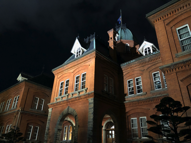 北2条通りを西に向かうと旧道庁 赤レンガ庁舎に突き当たる。昼間は観光客であふれる観光名所だが、夜になるとすっかり人通りも絶える。ライトアップされた建物は100年の歴史の風格だ。子供の頃はこの庁舎も現役で、木の板の床が油臭かったような記憶もあるが。