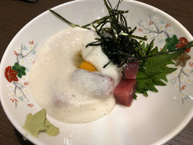 続いて、本マグロの山かけも注文。この辺り(どじょうにマグロ)はお江戸的なラインアップだが、お店も妙に地方発の食材を提供していないので、東京のうまいもの系で注文するのが良さそうだ。刺身で食べた方がよさそうなうまいマグロ赤身を長芋を絡めて食べると、なんだかとんでもない贅沢をしている気分がしてきた。料理の定石を守った品物が、なんと言ってもうまいものだと再確認。