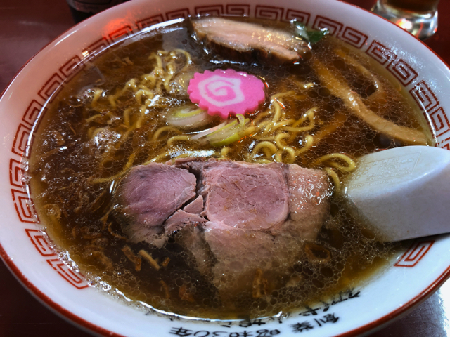 こういうノスタルジーを誘う内装の店だから、ラーメンも昭和40年代の世界観から一歩も外には出ない。北海道的な当時の標準形ラーメンとは、鶏ガラベースのスープ、カンスイをつかった縮れ麺、赤い渦巻のナルトとシナチク(メンマ)、そして固くて薄いチャーシューだ。当然ながら無化調などというはずがない。たっぷりと旨味調味料が入っていた。