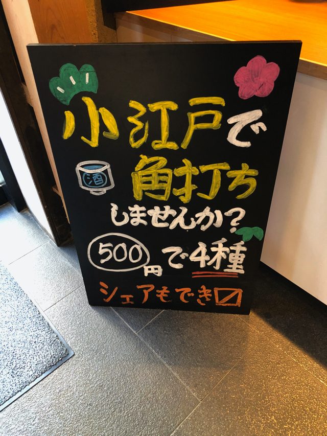 お猪口は山盛りにされていて、自分で取ってくる。追い水は、これまたセルフサービスで持ってくる。店内の解説によると、江戸時代に関西からの日本酒が江戸市場を独占していた時期があり、幕府が江戸からの資金流出を嫌い、現在の埼玉県あたりで酒を作ることを奨励したのが、埼玉県下に造り酒屋が多い理由だそうだ。地産地消の進めというより、東西経済不均衡が理由というのが何やらきな臭い。