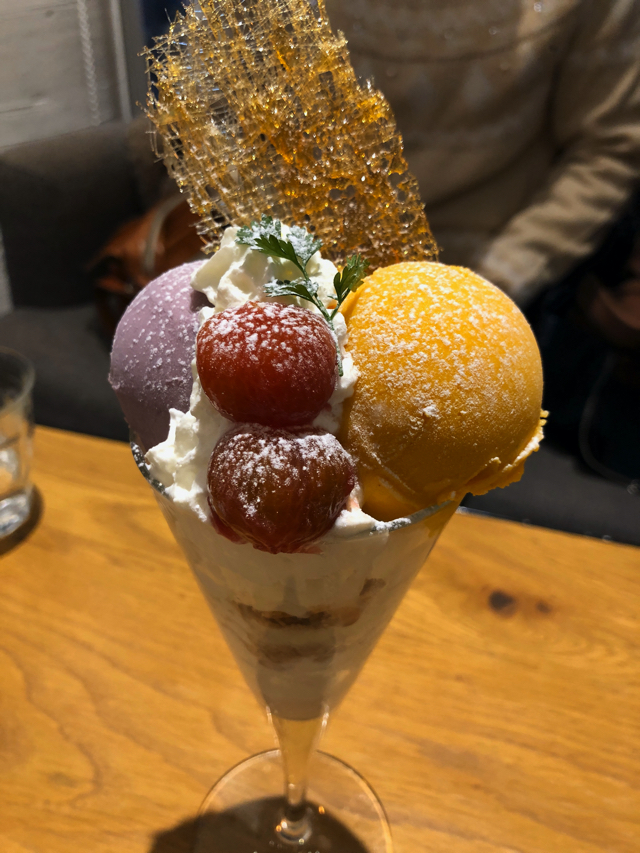 別の日にススキノちかくで食べたパフェは、完全に締めパフェで、まさしく今流行の食べ物だった。デコレーションは完璧というか、立体造形の美しさがビシビシと伝わる。かんざしのようにそびえ立っているのが、飴細工でできた金色のキャンディー?だった。野菜のパフェと言うからどんなものが出てくるのかと思ったら、野菜のピューレを使ったジェラート風なものだった。