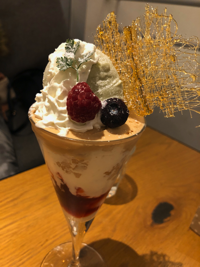 こちらはベリーのパフェと言うことで、金色の飴細工はちょっと変形の角度でデコレーションしているあたり、芸が細かい。パフェグラスの底の方には、これも流行のピスタチオアイス。昼はカフェ営業が、夜になるとドリンクとパフェだけになるスタイリッシュな店で、なるほどこれが締めパフェ空間というものかと、しっかりお勉強できたのは良いのだが・・・。