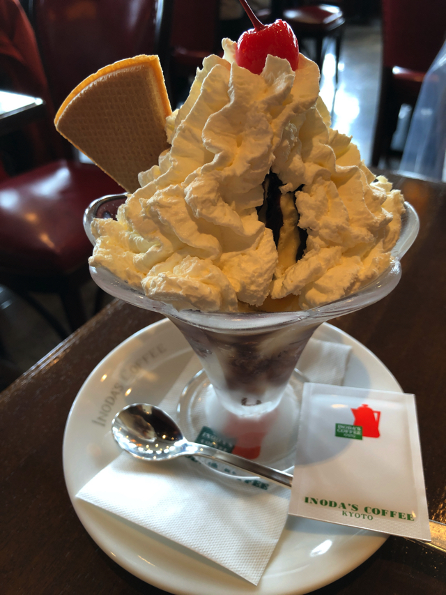 席に座り注文を考えていると、パフェがあることに気がついた。苦味強めのホットコーヒーを頼むつもりだったのが、気が変わってチョコレートパフェ にした。でてきたパフェはなんというか飾りっ気のないストロングスタイルなパフェだった。上半分はクリームがタッップり乗っている。中には硬めのアイスクリームにチョコレートソースとシンプルの極み。これは昭和どころか大正の香りさえしてくるレトロ感だ。イノダコーヒー、すごすぎだ。