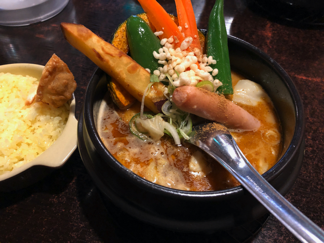 メニューを開け確かめてみると、やはりスープカレーとカレー?ラーメンが主力のようだ。当然のようにチキンのスープカレーを頼んでみたが、素揚げの野菜によく煮込んだ鶏肉というあたりはドがつく直球のスープカレーで、魚介出汁を強く感じるのが現在の流行の仕立てということだろう。ついてくるライスはどやらインディカ米らしい。そういえば札幌でハズレのスープカレーを食べた記憶がない。どの店も研究熱心ということだろうか。半分くらい食べたあたりから、どっと汗が出てくるのは、正しいスパイス料理ということだ。