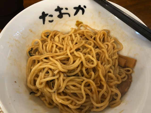 それをこれでもかというくらい上下にひっくり返し混ぜ続ける。5回程度ではタレと麺が馴染まないので、エイヤエイヤと30回ぐらい混ぜた姿がこれ。なんだか見た目はかなり悲しげになっている。カップ焼きそばも見た目はこんな感じだなあなどと思ってしまう。この辺りも油そばが苦手な理由で・・・。