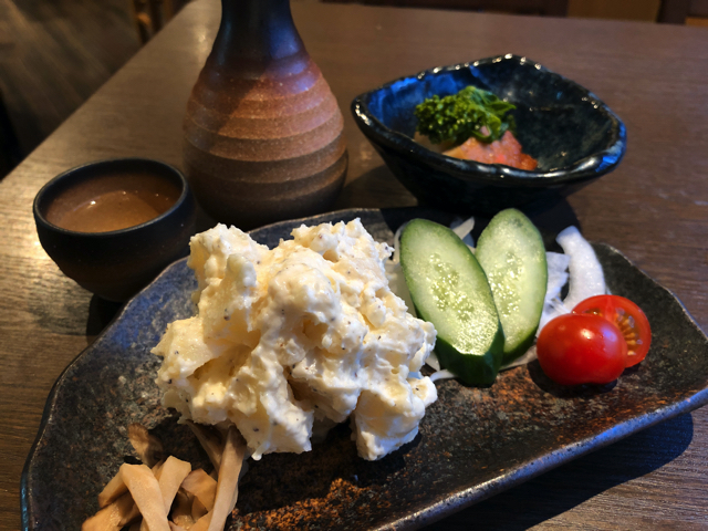 流石に居酒屋チェーンでよく出る白い小皿にポテサラがディッシャーでひとすくい的な味気のない盛り付けではない。おそらく大量に作ったポテトサラダが大きい密閉容器に入っていて、蓋を開けたらそこから菜箸でひとつまみ、ふたつまみと取り出しました的な不規則な盛り付けだ。おまけのように千切りキャベツと胡瓜とミニトマト。これが昭和の居酒屋的美学なのだ、と一人興奮しながら、ポテサラをつまみに銚子を一本あければ、世の中とても平和で幸せな気分になる。