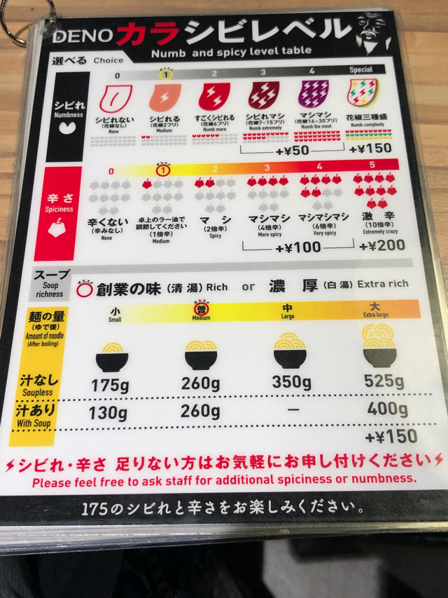 選択肢は「痺(シビ)れ」「辛さ」「スープの濃さ」「麺の量」「汁のありなし」。図解されるとよくわかるが、自販機にこの図解はない。行列ができていたら後ろの人に気兼ねするレベルの複雑さだった。選択肢を決めてボタンを押した後でも、これで自分の選択は正しかったのだろうかと疑問が頭から離れない。困った店だ・・・。