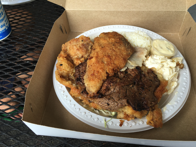 バーベキュービーフプレート、ウァイトライス、ウィズフライズ、ノーグレービー、ラージコーク、トゥゴウ。ザッツオール。