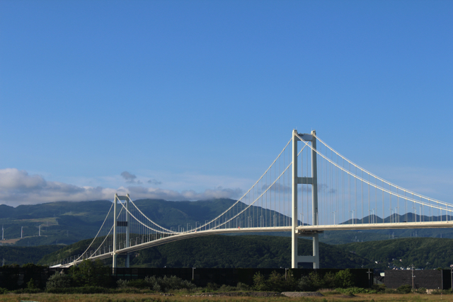 二つ目が室蘭の白鳥大橋。これも山川からではなく、道の駅に回り込んで見ると、こんな具合の美しいバランスで見ることができる。