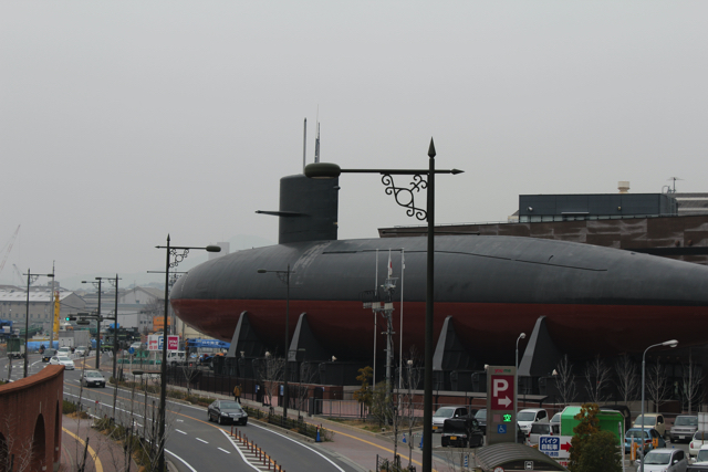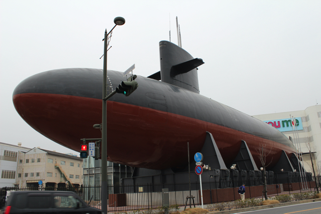 広島県呉、大和ミュージアムの隣に異様な建造物がある。海上自衛隊の広報施設「てつのくじら」館。この潜水艦の中が展示施設になっている。いや、これはじつに大きい。陸上に上がった船としては最大級のような気もする。