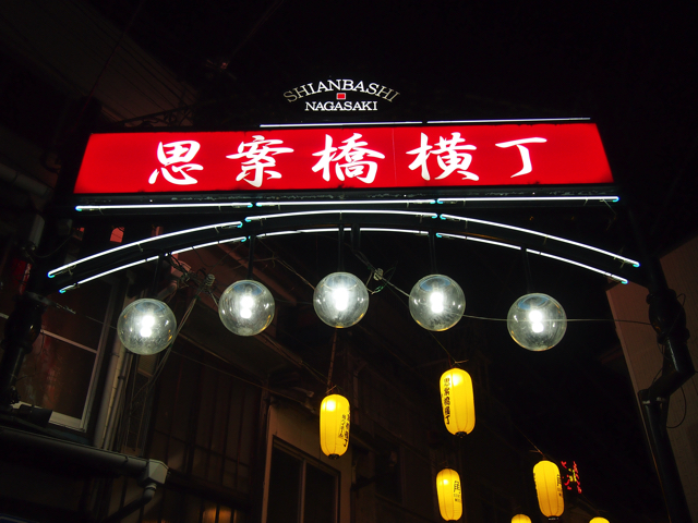 1人卓袱を堪能して電車に乗って、かの有名な思案橋界隈まで遠征すると、このゲートがお出迎えしてくれる。大都市の繁華街ではビルの中に引きこもっている飲み屋も、この思案橋界隈ではせいぜい2階建てなので、そぞろ歩きが実に楽しいし、びっくり看板発見の機会だ。