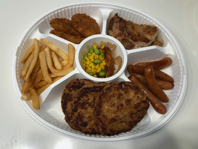 ファミリーセットという1000円特別価格の販売メニューだが、これも定価はわからない(普段は売っていない)ので、お買い得と言えるかどうかは問題ありなのだが、ハンバーグ3枚とグリルチキン2枚に、ポテトやソーセージのおまけが少々。肉肉しいセットなので、確かに小学生くらいの子供がいる家庭には人気があるかもしれない。
