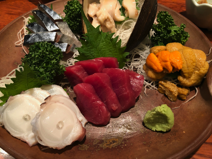 札幌の居酒屋で、今日はウニが良いよと言われて、ウニを入れた盛り付けを頼んだら、なんだか不思議な組み合わせが出てきた。実に北海道らしいと言えばいいのだろうか。ウニは積丹(しゃこたん)の馬糞ウニ、襟裳産のツブ貝、自家製しめ鯖は小樽、産地は聞き忘れた北海道産のタコ。(水だこだろう)