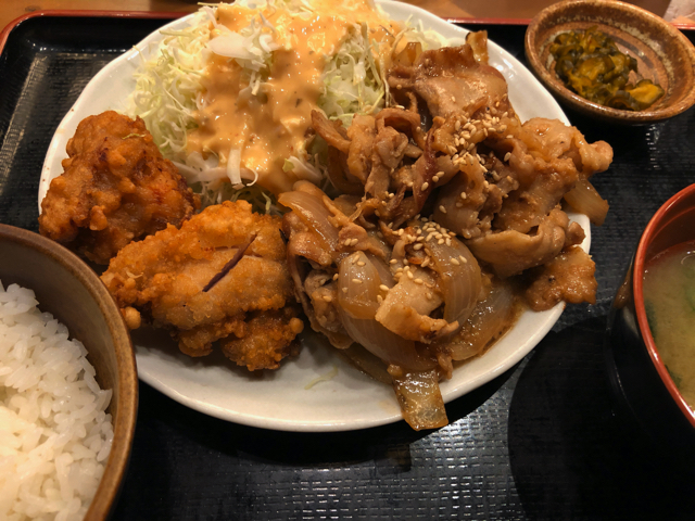 鳥の唐揚げと豚の生姜焼きといえば、がツン系ランチ定食の二大巨塔というか、絶対のツートップという感じがする。唐揚げも生姜焼きもローカル・ルールが多すぎて何が正統かという議論もしがたいが・・・。声が大きい方が勝つというか、これが生姜焼きと言い張れば生姜よりもニンニクが強くても生姜焼きになる世界だ。