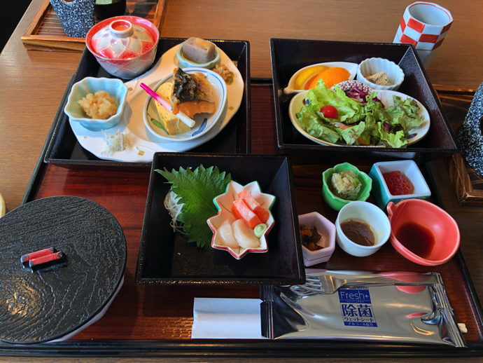 嬉しいのはたっぷり目の野菜サラダで、ビュッフェスタイルでは遠慮なく野菜1日分くらいを食べるのだが、定食だとこれくらいのボリュームで十分だ。あとは、チマチマとした一口サイズの小鉢が嬉しい。伊豆あたりの民宿でアジの開きと大盛りご飯みたいな朝食もいいが、この手の懐石弁当的な小料理の大量供出は嬉しい。